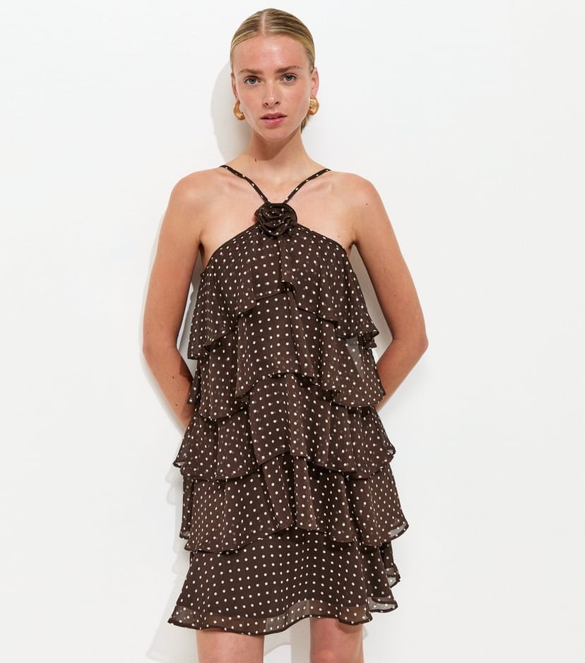 The New Look Brown Polka Dot Ruffle Halterneck Mini Dress is made from chiffon.