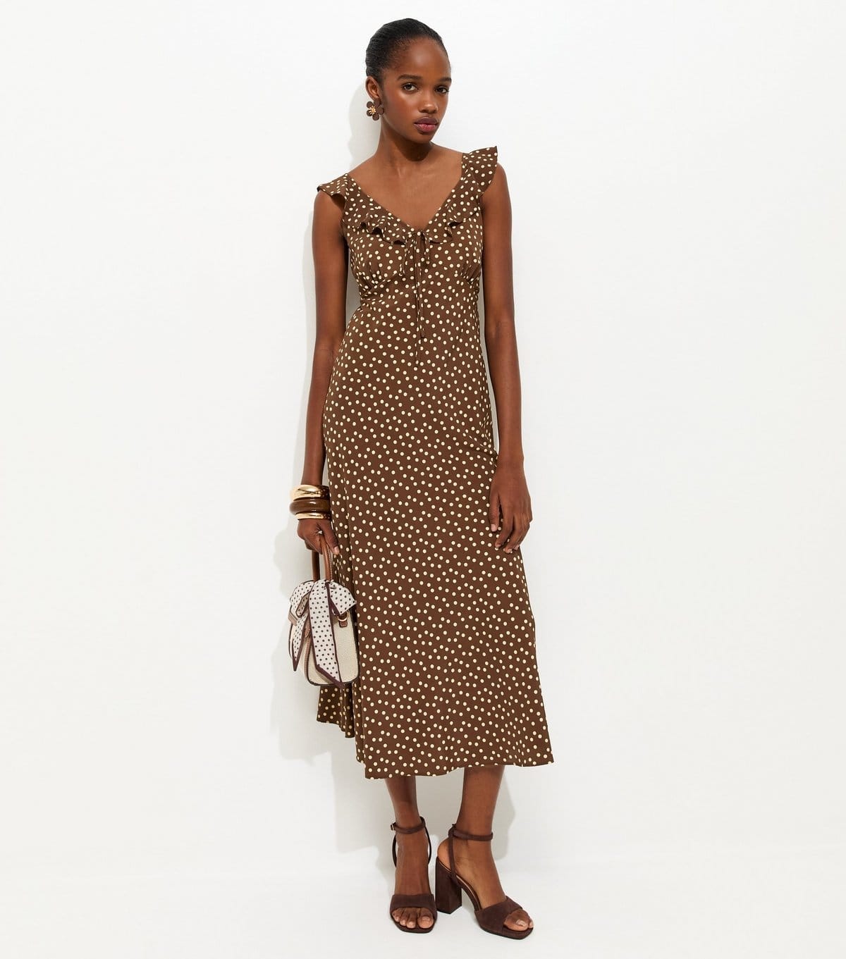 Daytime glamour with this brown polka dot midi dress featuring a ruffled v-neckline and adjustable ruffled straps. The woven lightweight fabric ensures comfort and style.