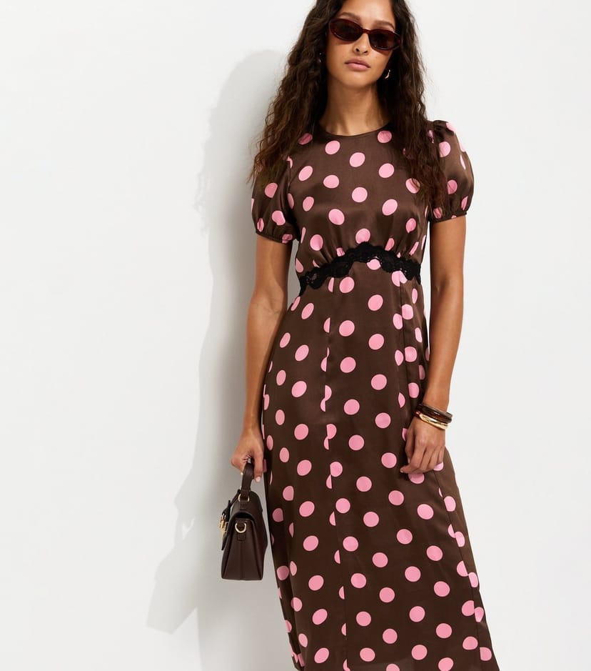 The New Look Brown Polka Dot Puff Sleeve Midi Dress is made from satin, lace.