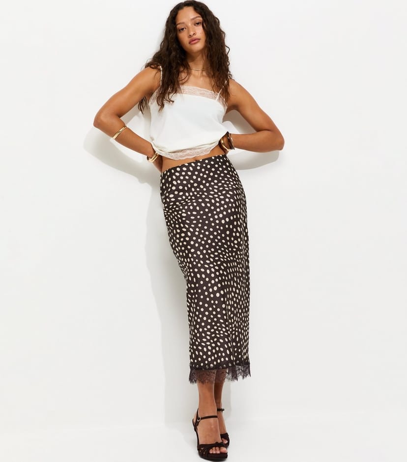 The New Look Brown Satin Spotty Lace Trim Midi Skirt is ideal for casual, evening, date-night.