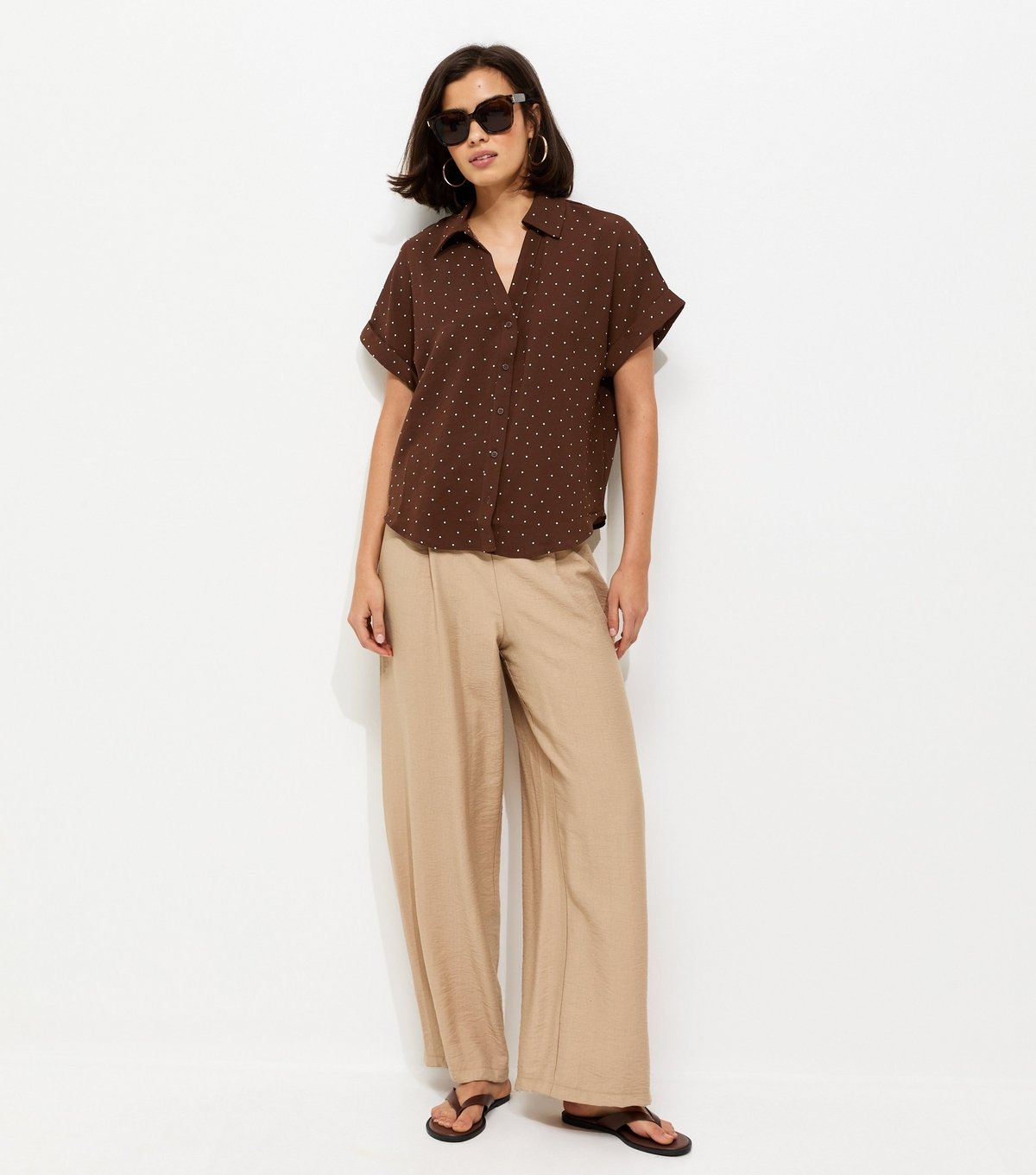 The New Look Brown Spot Print Short Sleeve Shirt is available in sizes 10, 12, 14, 16, 18, 20, 22, 6, 8.