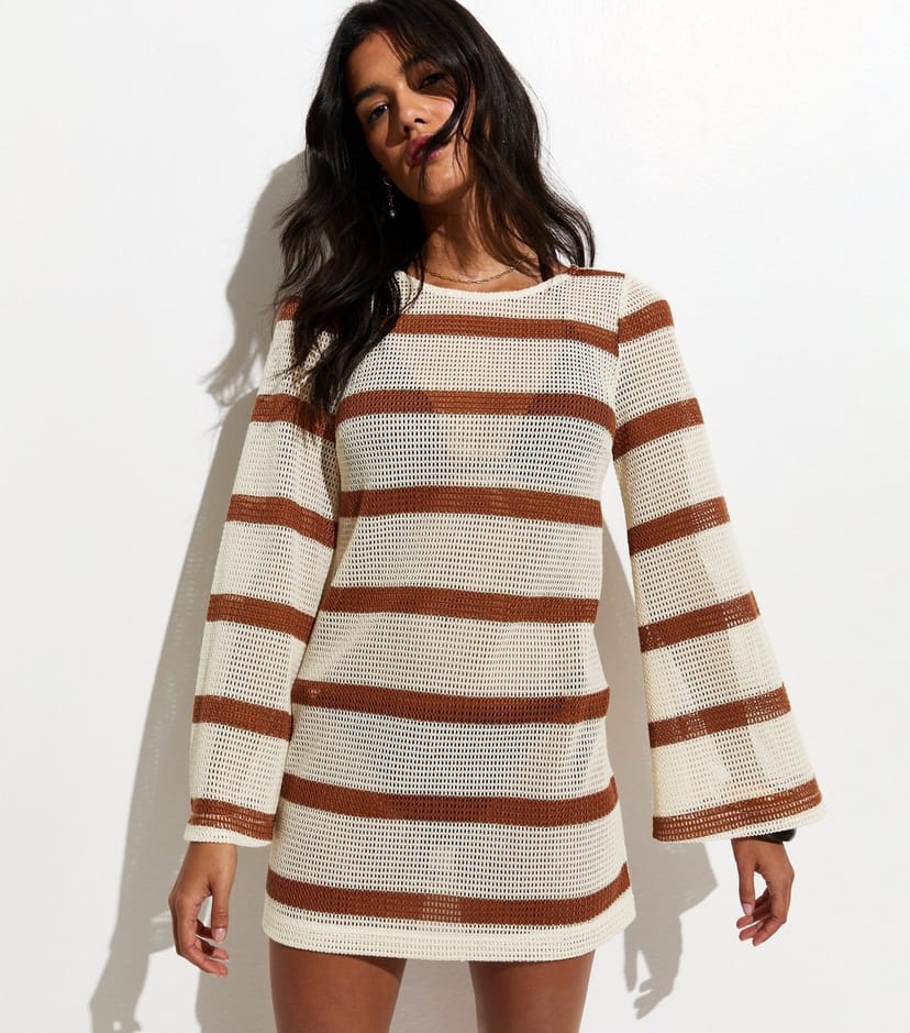 The New Look Brown Striped Crochet Knit Kaftan is available in sizes 10, 12, 14, 16, 18, 6, 8.