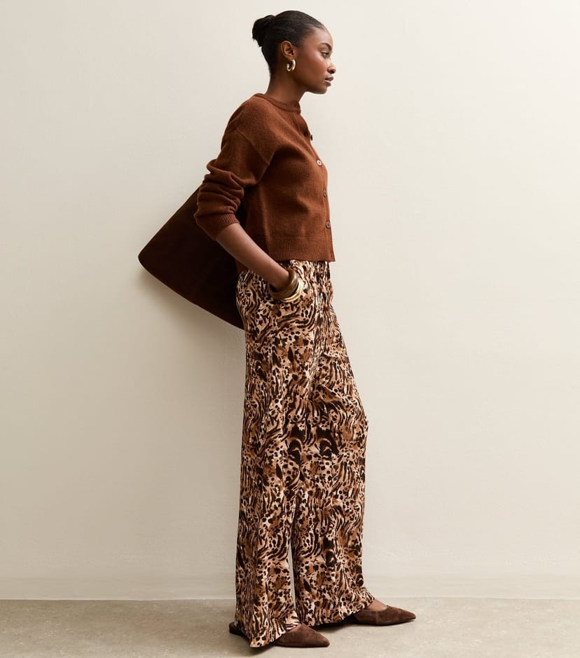 The New Look Brown Tiger Print Wide Leg Trousers is available in sizes 10, 12, 14, 16, 18, 20, 6, 8.