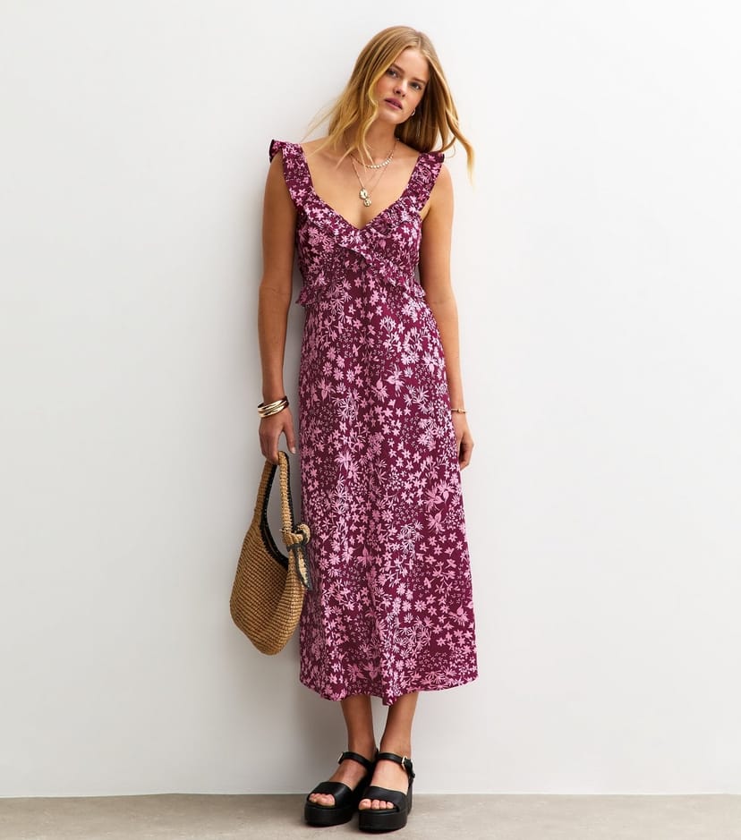This burgundy floral print midi dress by New Look features a V-neckline and ruffled straps. Made from woven fabric, it offers a slim fit and is perfect for summertime.