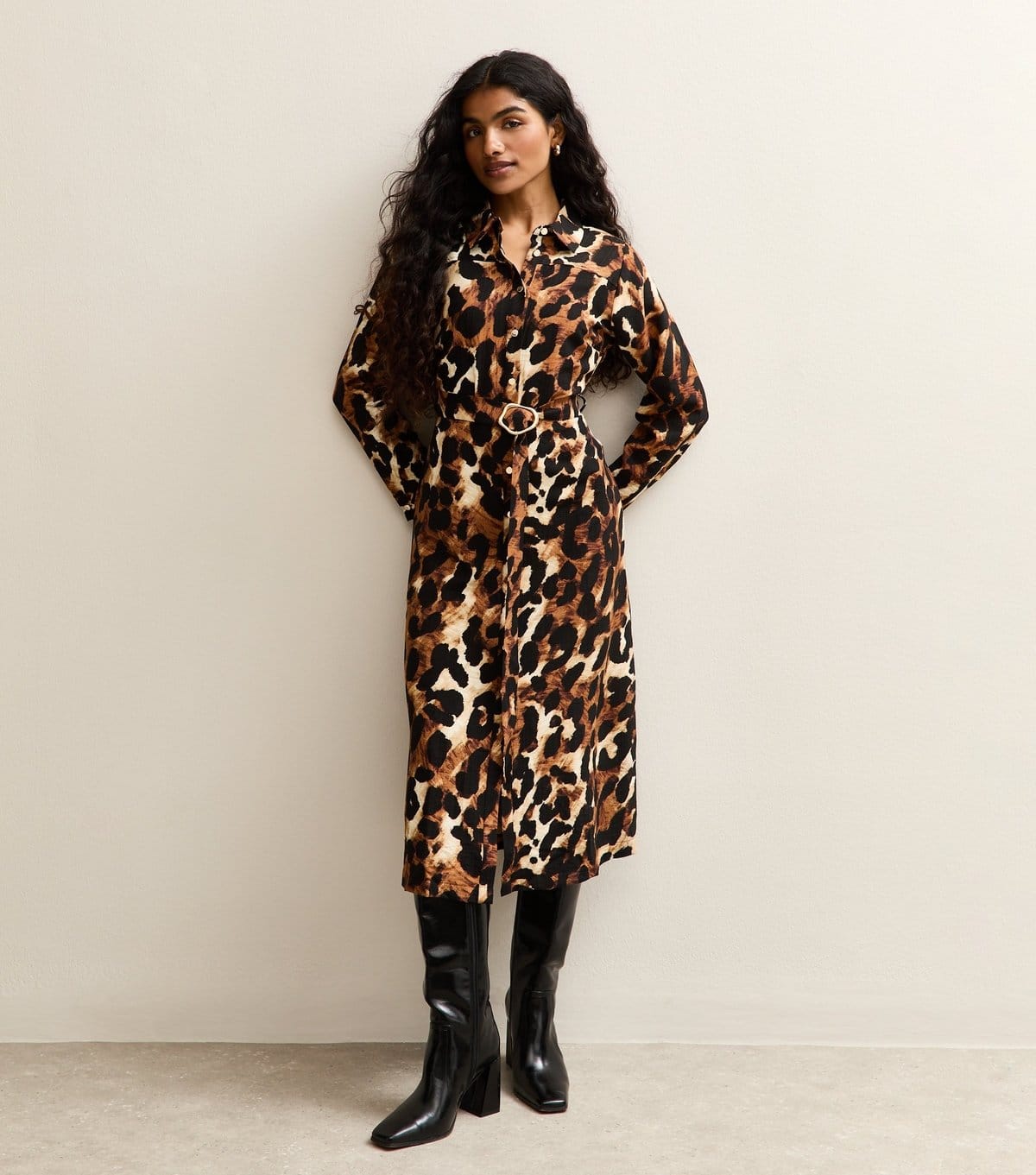 Versatile midi dress in brown animal print with a collar neckline and long sleeves. Its belted waist adds a flattering touch, perfect for both casual and smart wear.