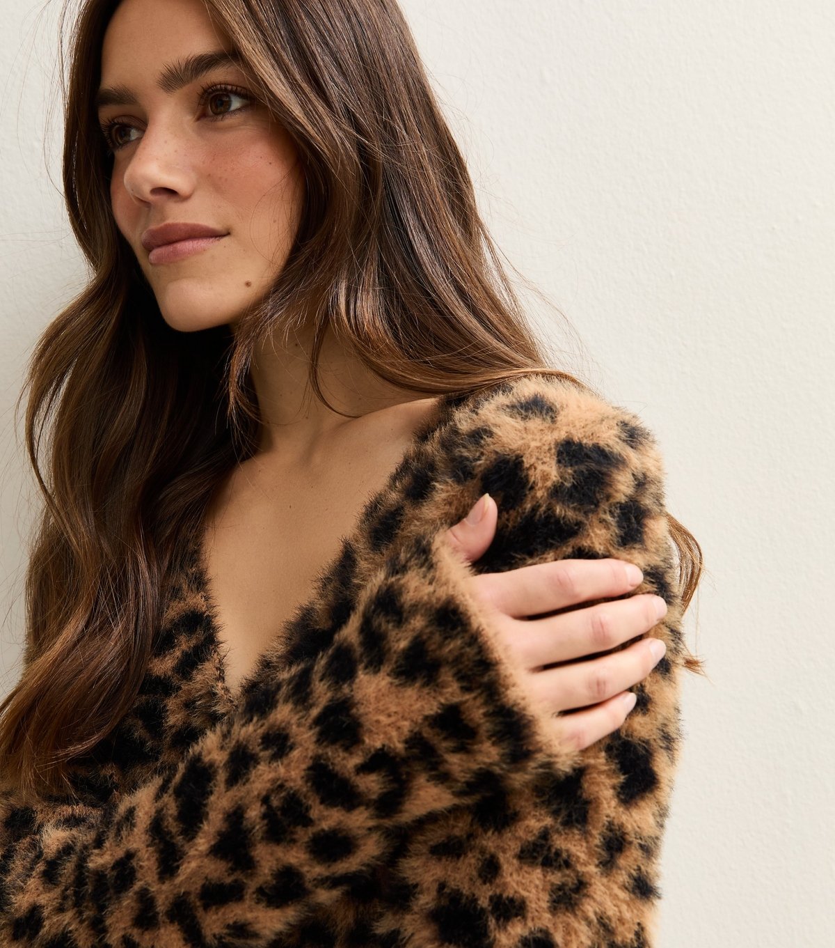 The New Look Brown Leopard Pattern Fluffy Cardigan is made from faux fur.