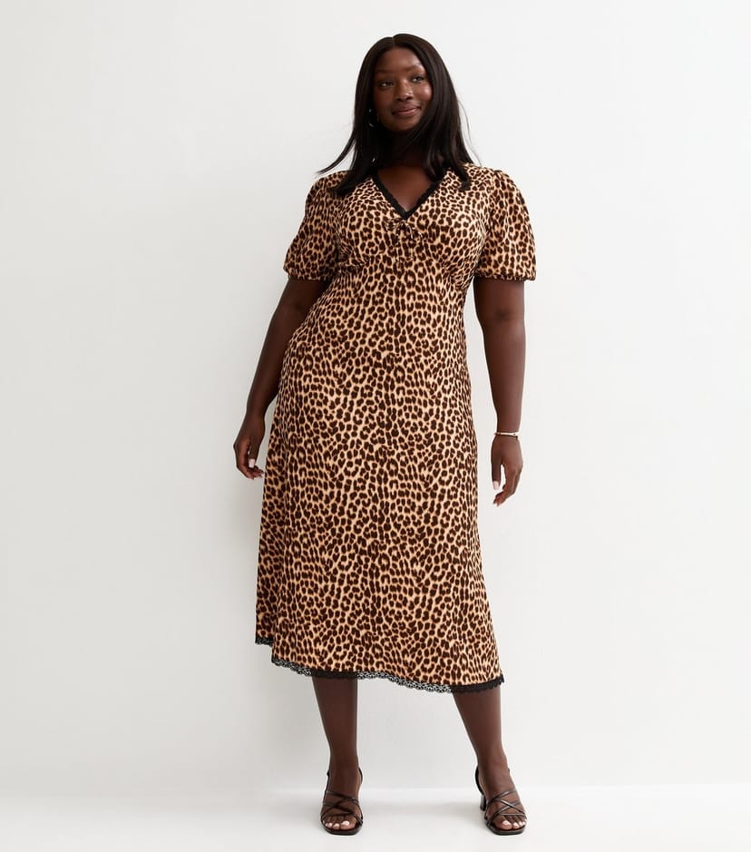 The New Look Brown Animal Print Midi Dress is available in sizes 18, 20, 22, 26, 28, 30, 32.