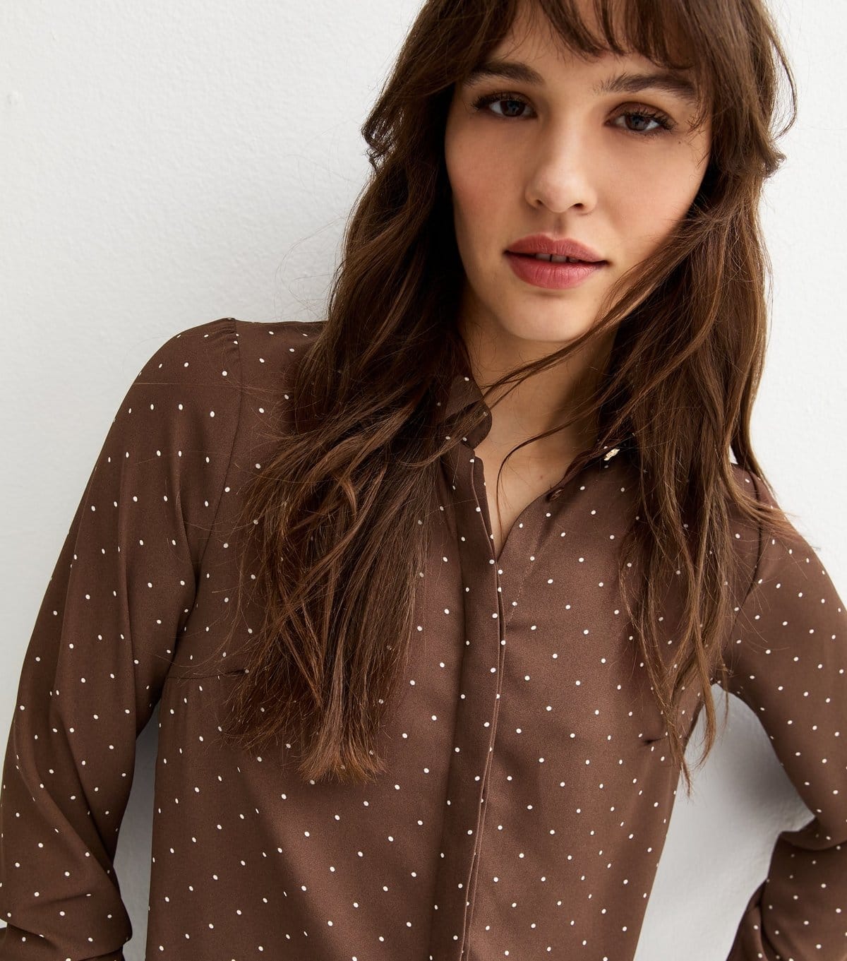 View New Look UK's returns policyThis brown spotty button-up shirt from New Look features a concealed button placket with a gold-tone button at the neck, adding a touch of elegance. Its classic collar and playful print make it perfect for both work and weekends.