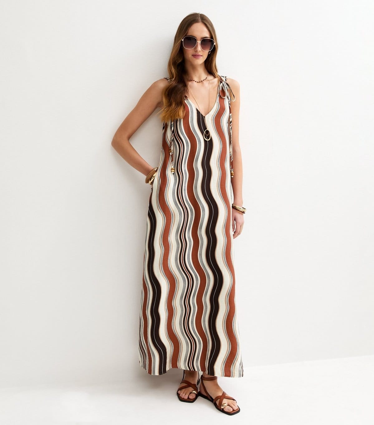 This brown waves smock dress by New Look is perfect for summer soirées. Featuring a deep V-neckline, ruched straps with beaded ties, and a loose A-line silhouette, it's a standout piece for any occasion.