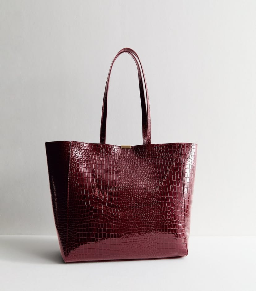 This Burgundy faux patent leather tote from New Look boasts a crocodile effect with golden details. It's spacious and perfect for everyday use, combining style and functionality.