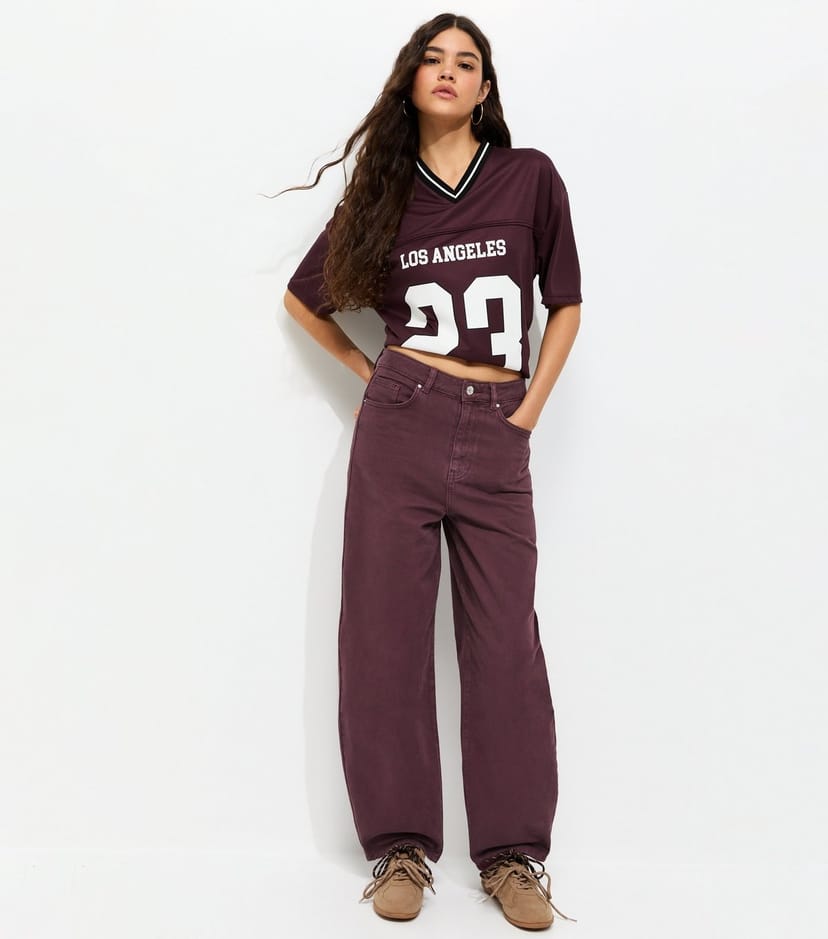 See all outfit ideasTrendy burgundy barrel leg jeans with a relaxed fit and non-stretch denim fabric. Features classic five pockets and belt loops. Perfect for a casual, laid-back look.