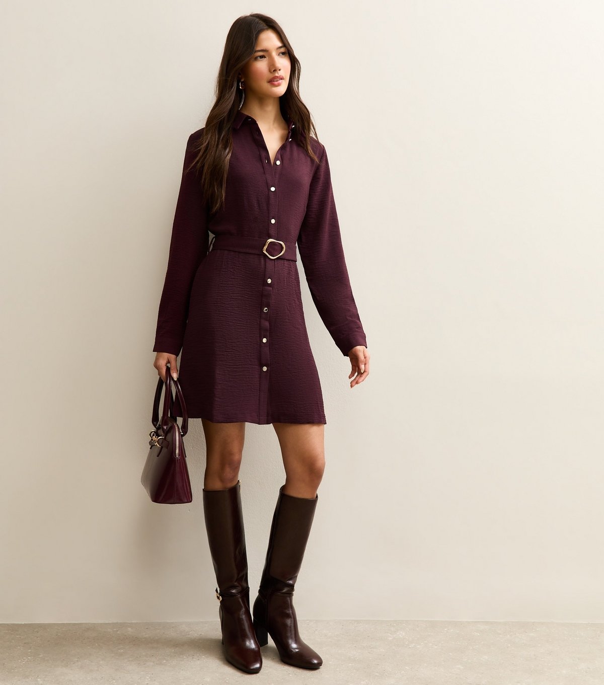 The New Look Burgundy Belted Button Through Mini Shirt Dress is available in sizes 12.