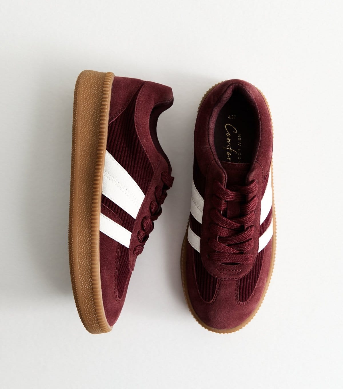 The New Look Burgundy Corduroy Panelled Vegan Trainers is available in sizes 5, 7, 8.