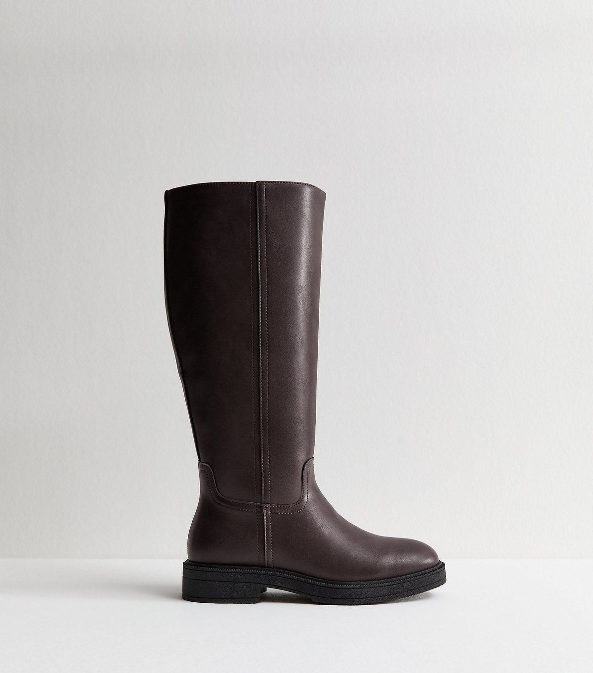 Stylish burgundy faux leather knee-high riding boots from New Look. Designed for effortless style and comfort, these pull-on boots are perfect for casual days out. The flat design ensures all-day comfort, and they are completely vegan.