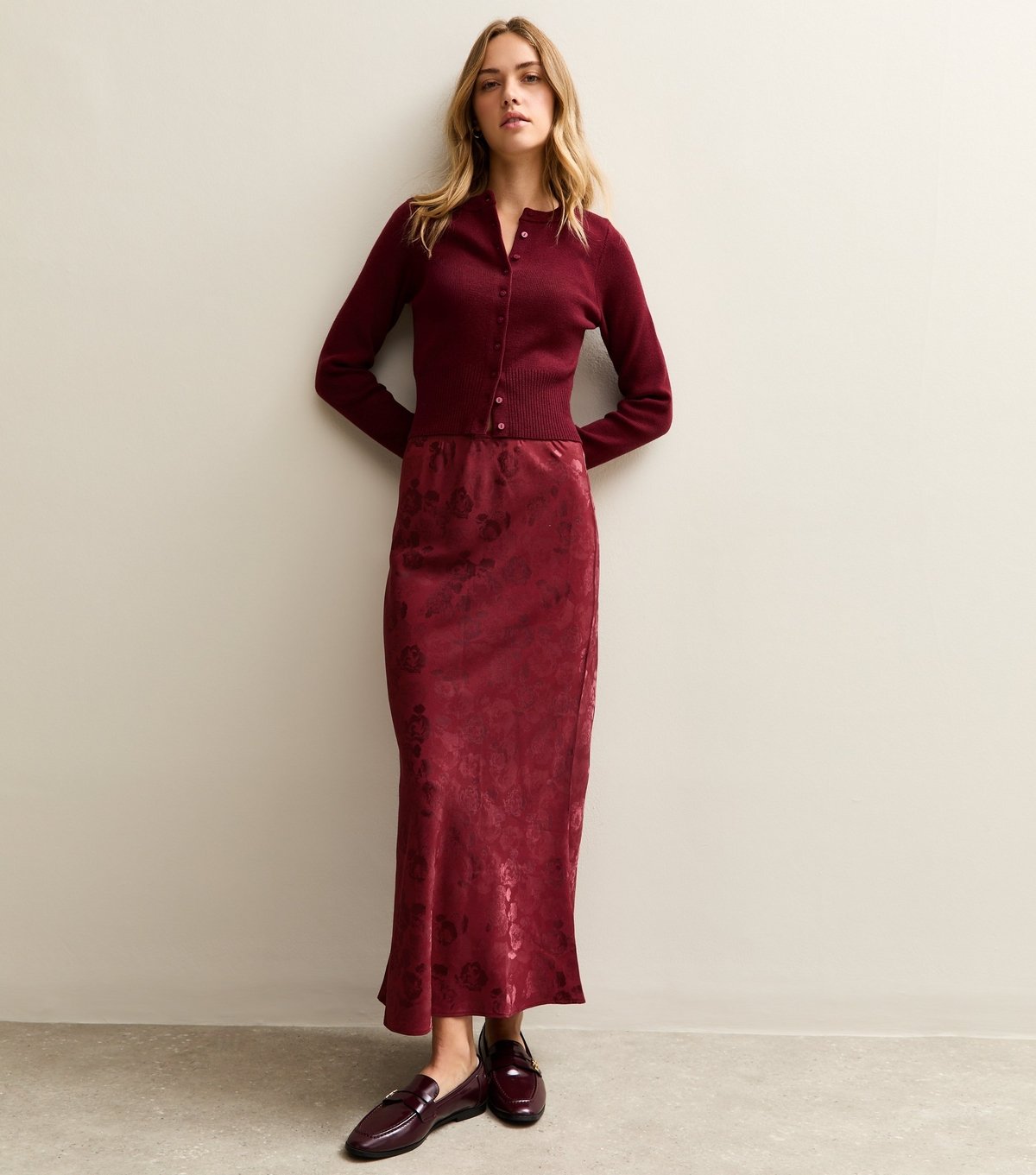 This burgundy floral jacquard slip skirt from New Look features a close fit and extends to a demure maxi length. Ideal for elegant occasions.