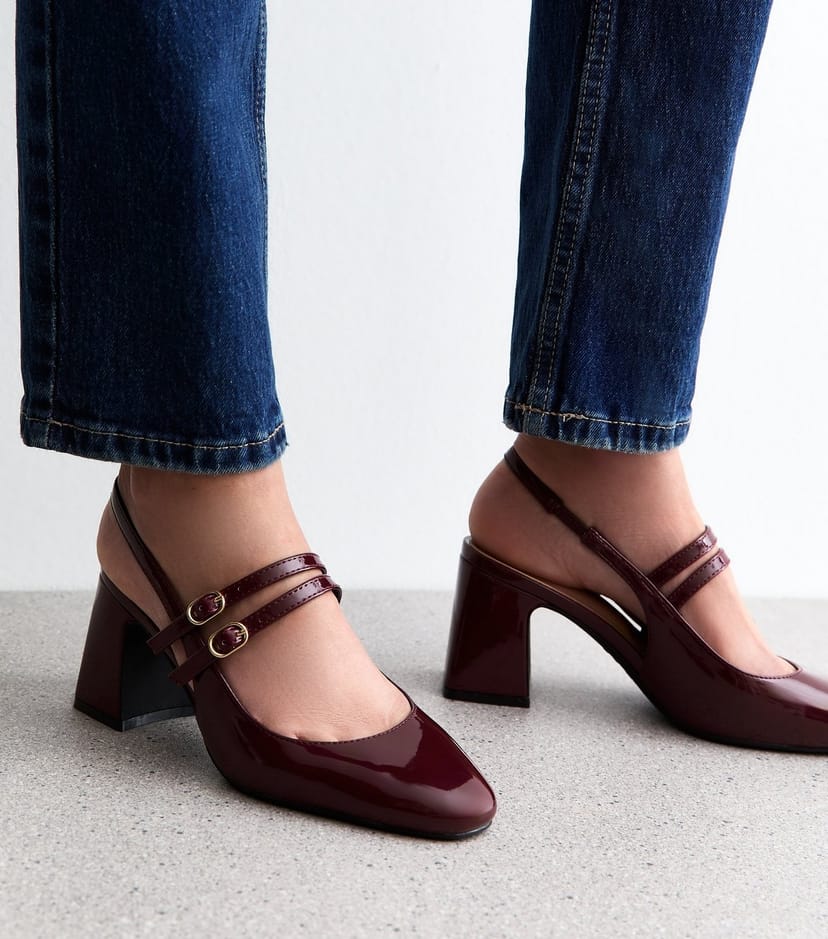 View New Look UK's returns policyElegant Mary Jane shoes in burgundy patent faux leather with a block heel and gold buckles. Perfect for adding a touch of polish to your evening looks or office attire.