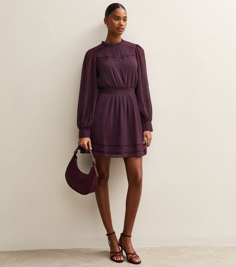 This dark burgundy mini dress is a go-to piece for the winter months. Featuring a flattering fit and a stylish high neck, it's a versatile style you'll wear time and again. Made from chiffon with a geometric dobby texture, this dress is perfect for casual outings or evening events.