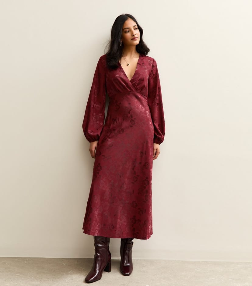 The New Look Dark Burgundy Floral Long Sleeve Midi Dress is made from jacquard, polyester.