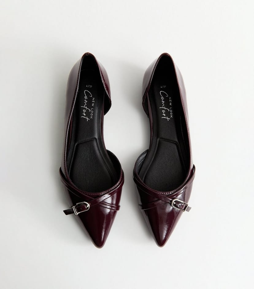 View New Look UK's returns policyThese burgundy faux leather flats offer a glossy patent finish with a sleek D'Orsay design and pointed toe. Ideal for smart-casual and everyday wear, they feature a crisscross buckle detail.