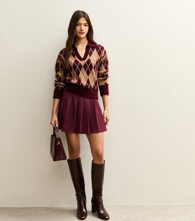 This dark burgundy mini skirt from New Look features a pleated design and crepe jersey fabric. Ideal for a preppy edge in your winter wardrobe, pair it with tights and boots for a cosy look.