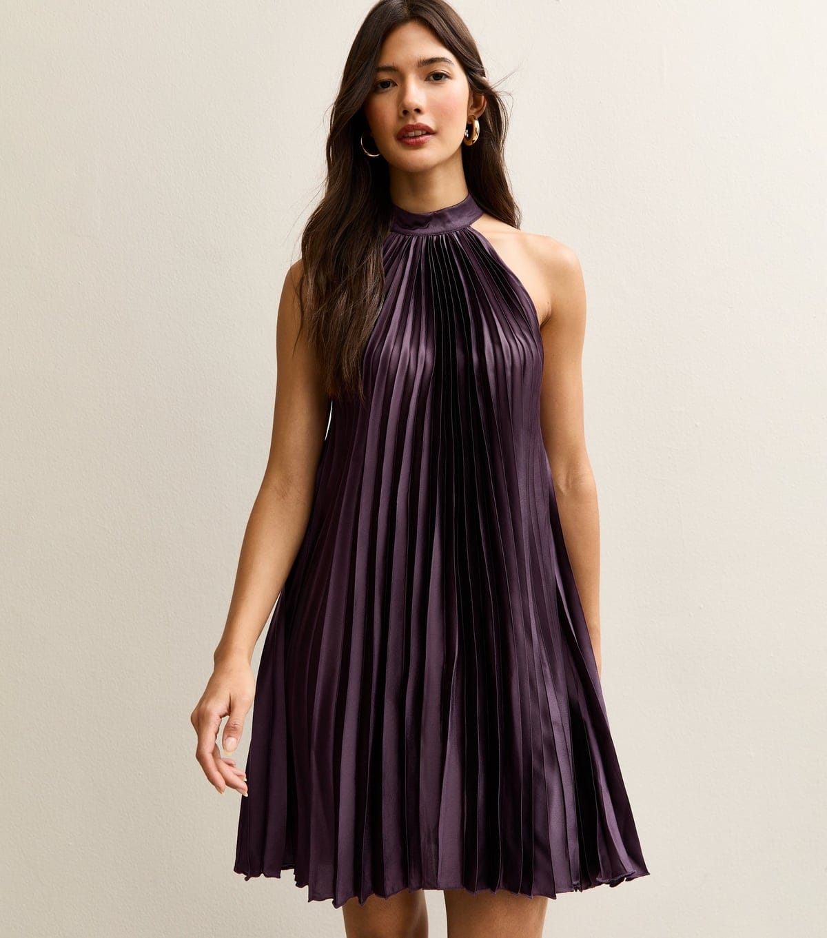 The New Look Dark Burgundy Satin Pleated Halterneck Mini Dress is available in sizes 12, 18.