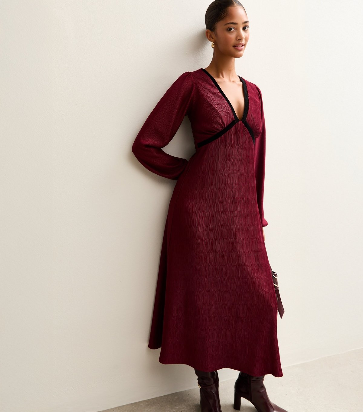 This dark burgundy midi dress features a V-neckline and a textured plisse finish. Its flowy long-sleeve style and plush velvet neck trim make it perfect for dinner dates and parties.