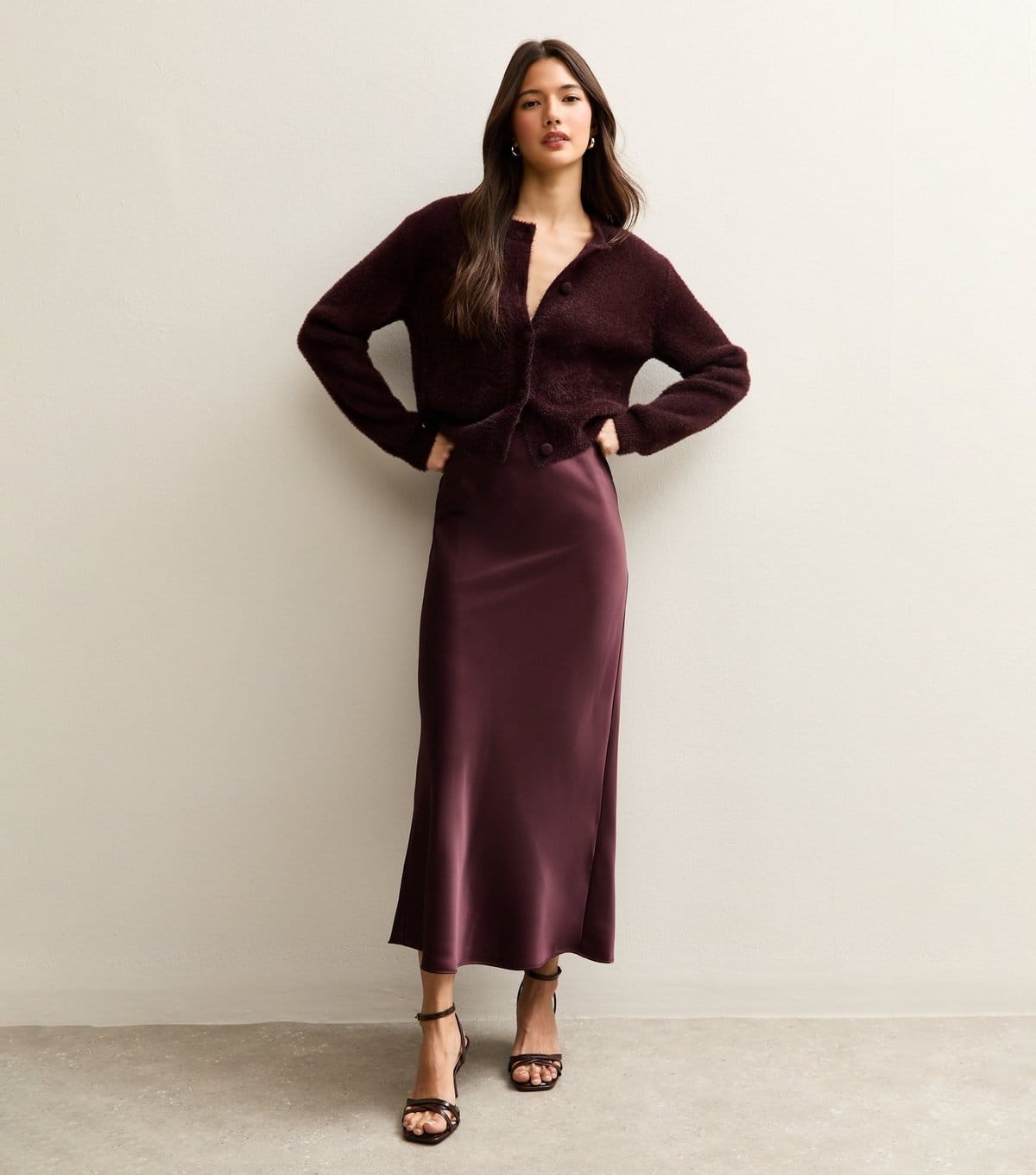 The New Look Dark Burgundy Satin Midi Skirt is available in sizes 12.