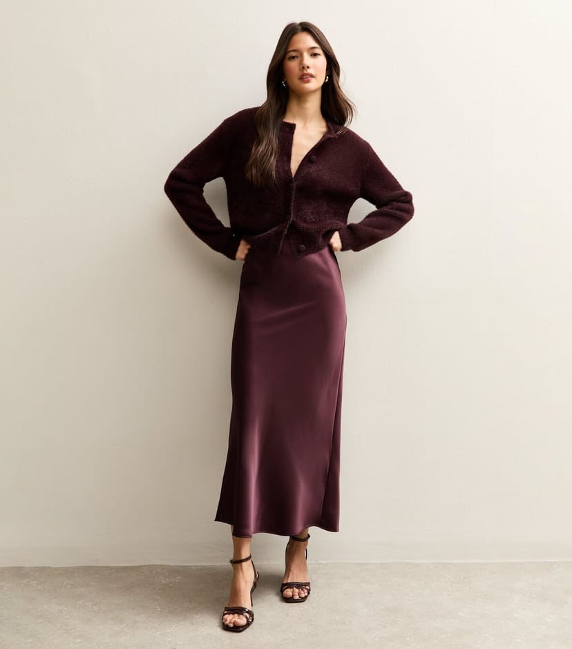 The New Look Dark Burgundy Satin Midi Skirt is made from satin.