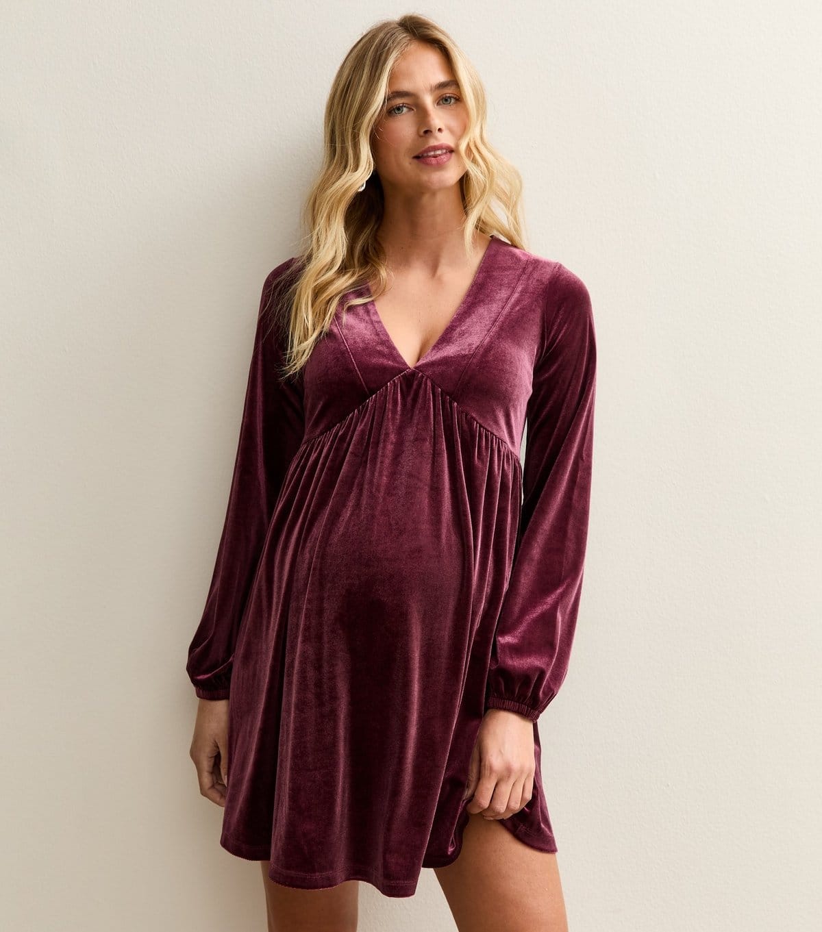 The New Look Burgundy Velvet Maternity Mini Dress is made from velvet.