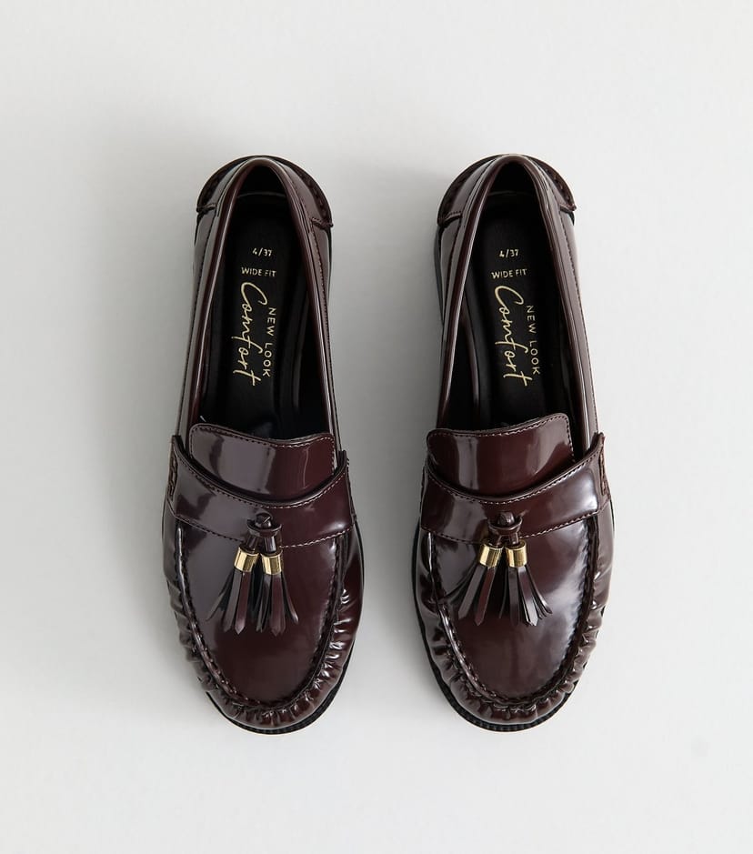 The New Look Burgundy Patent Faux Leather Loafers is available in sizes SIZE 4 - WIDE FIT, SIZE 5 - WIDE FIT, SIZE 6 - WIDE FIT, SIZE 7 - WIDE FIT, SIZE 8 - WIDE FIT.