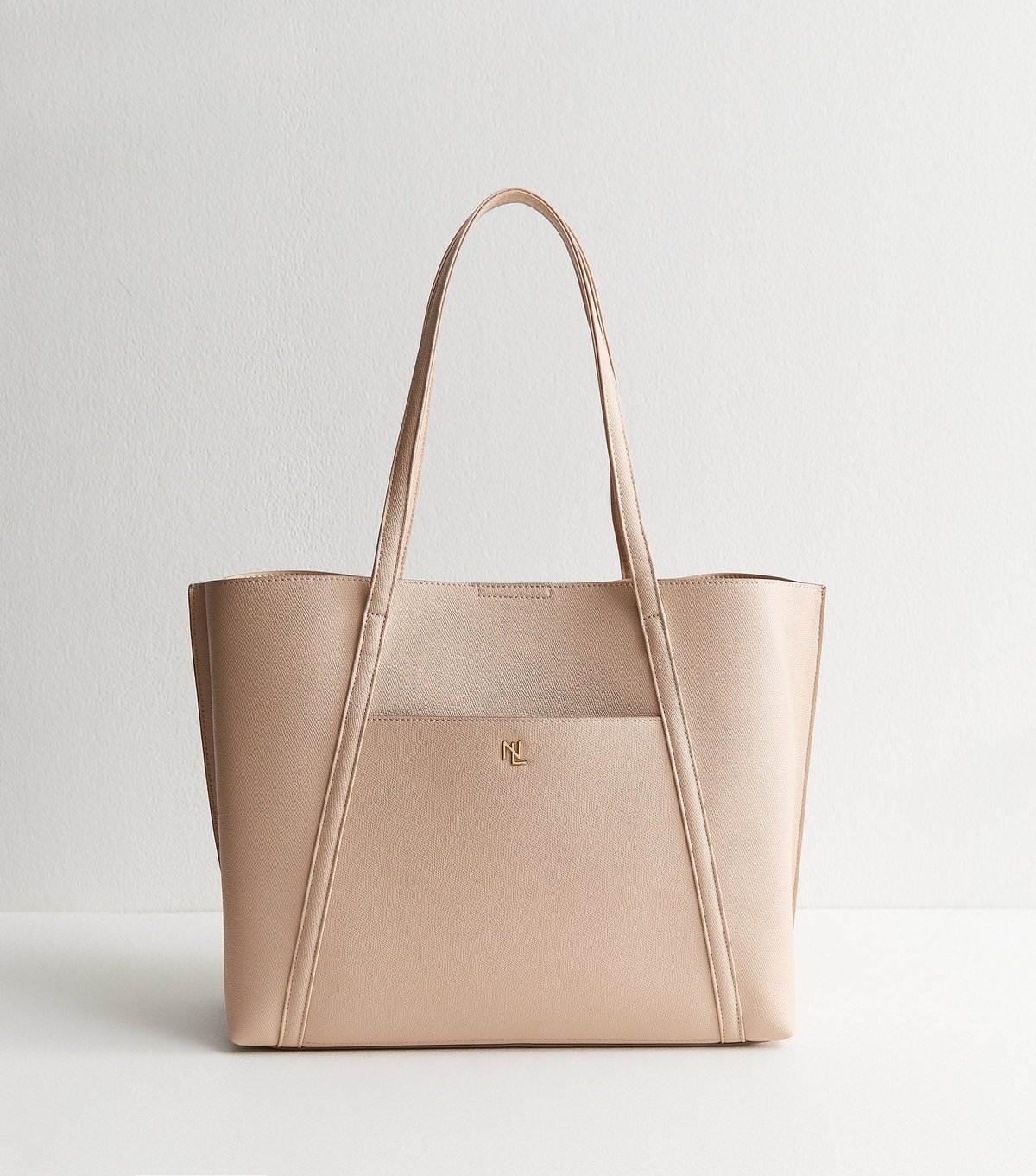 Stylish Camel faux leather tote bag from New Look. Its minimalist design features a handy front pocket and a simple 'NL' monogram for a signature finish. Perfect for everyday use.