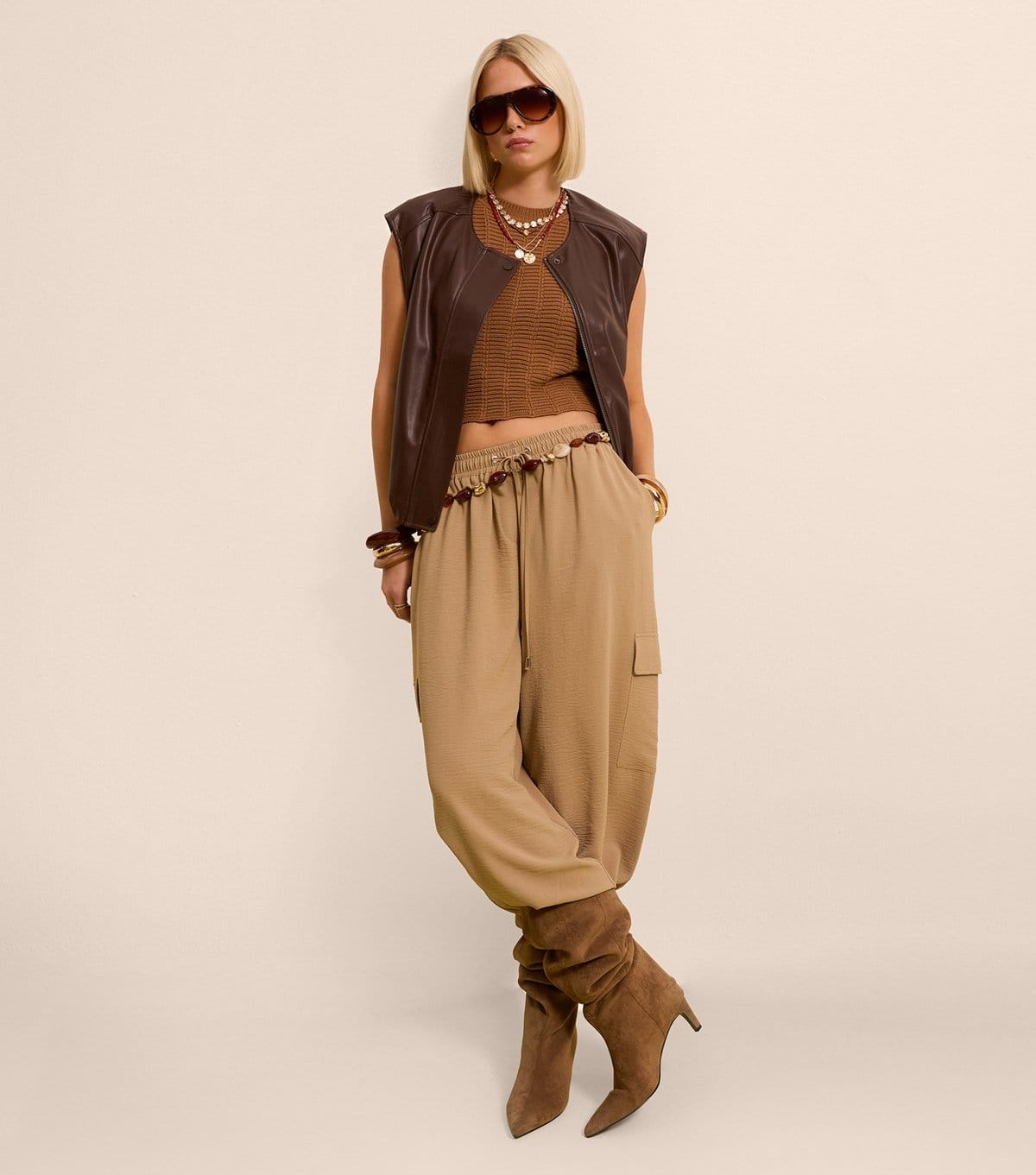 Pair with a brown cropped tank top and brown ankle boots for a cohesive look.