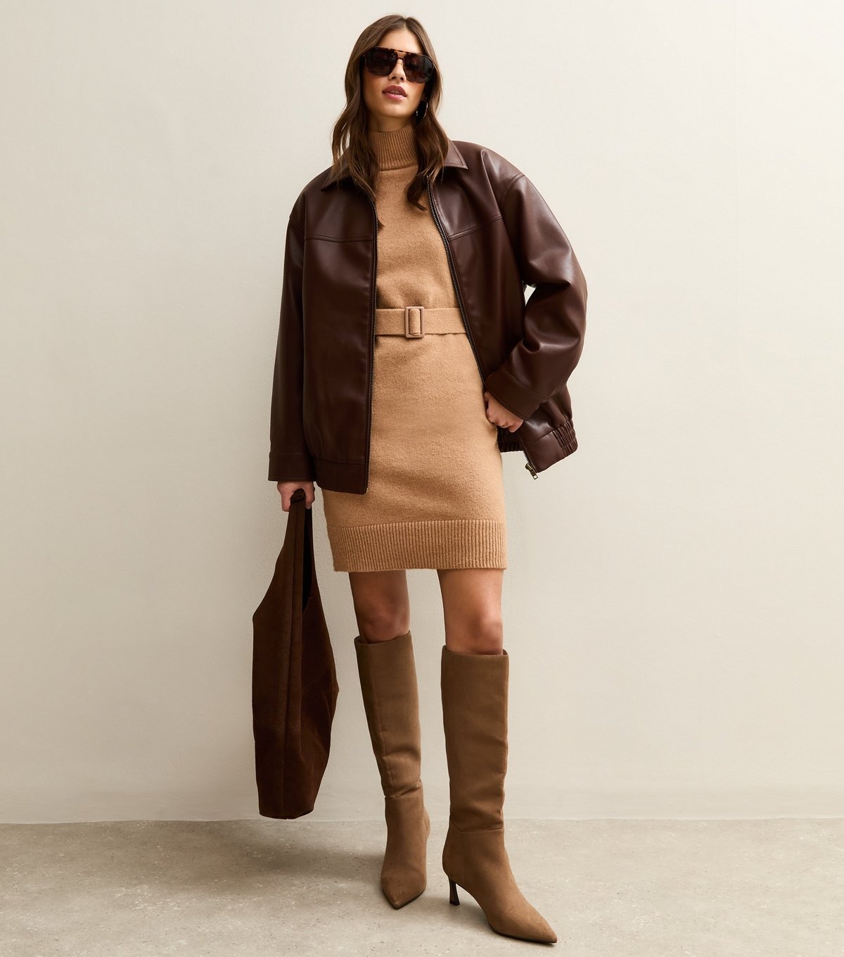 The New Look Camel High Neck Belted Mini Dress is made from stretchy knit.