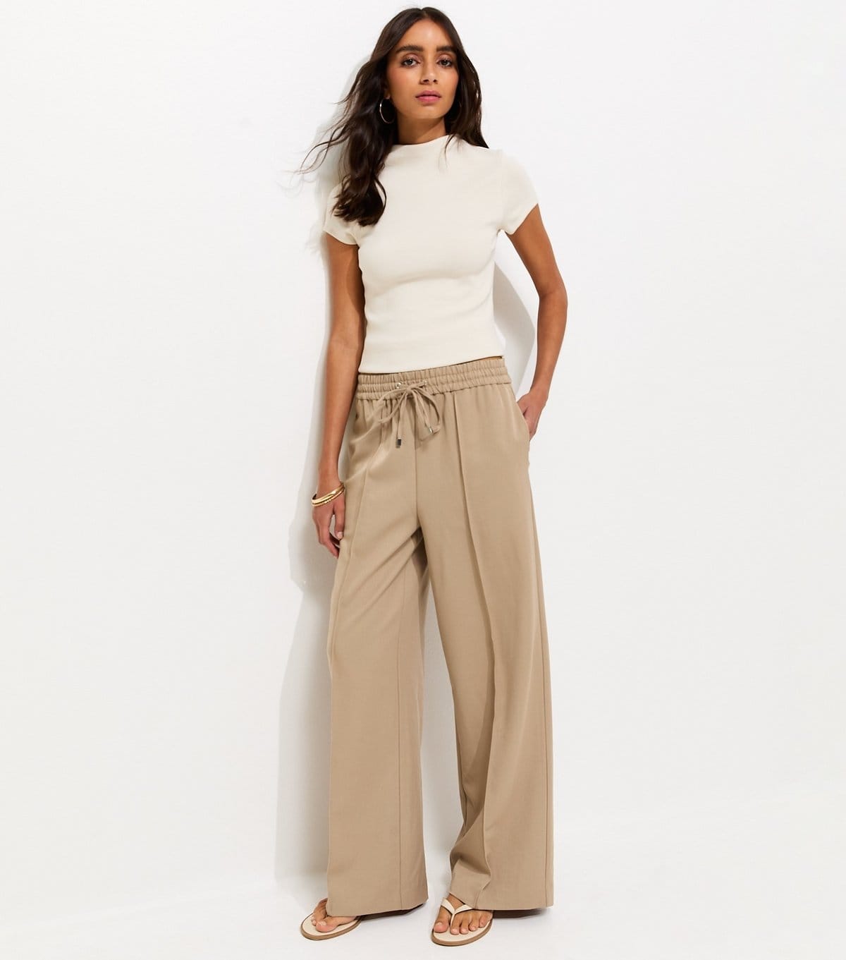 Stylish camel wide leg trousers with a drawstring waist and relaxed fit. Perfect for both everyday wear and smart evening occasions.