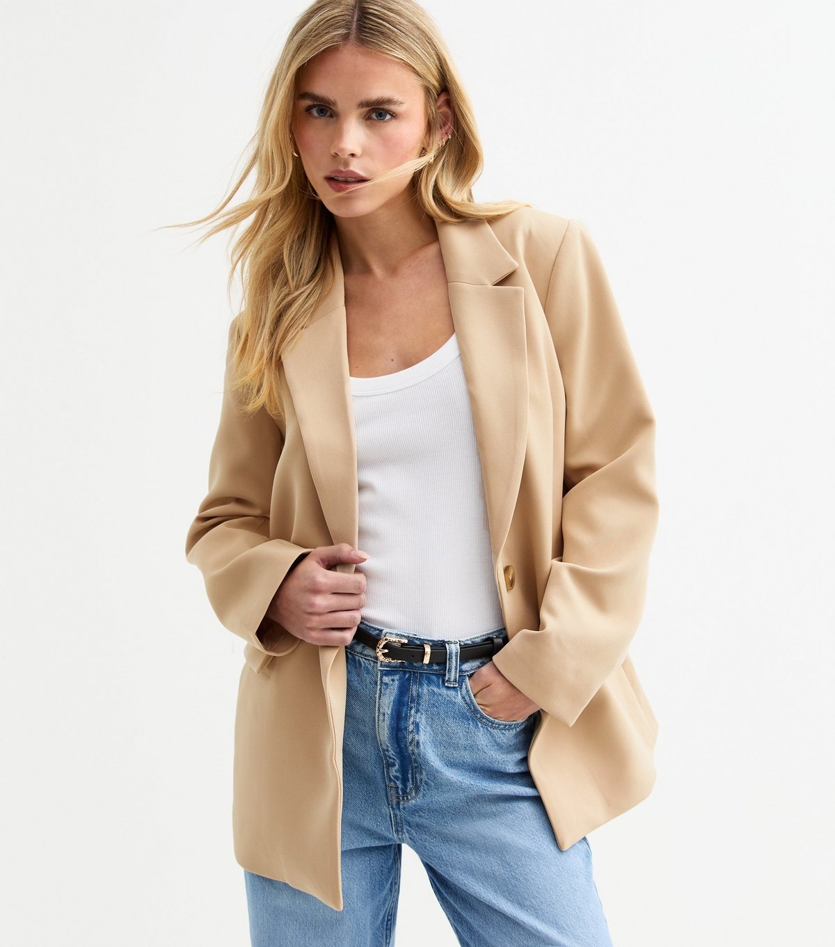 The New Look Camel Woven Longline Blazer for Petite Women is available in sizes 10, 14, 16, 4, 6, 8.