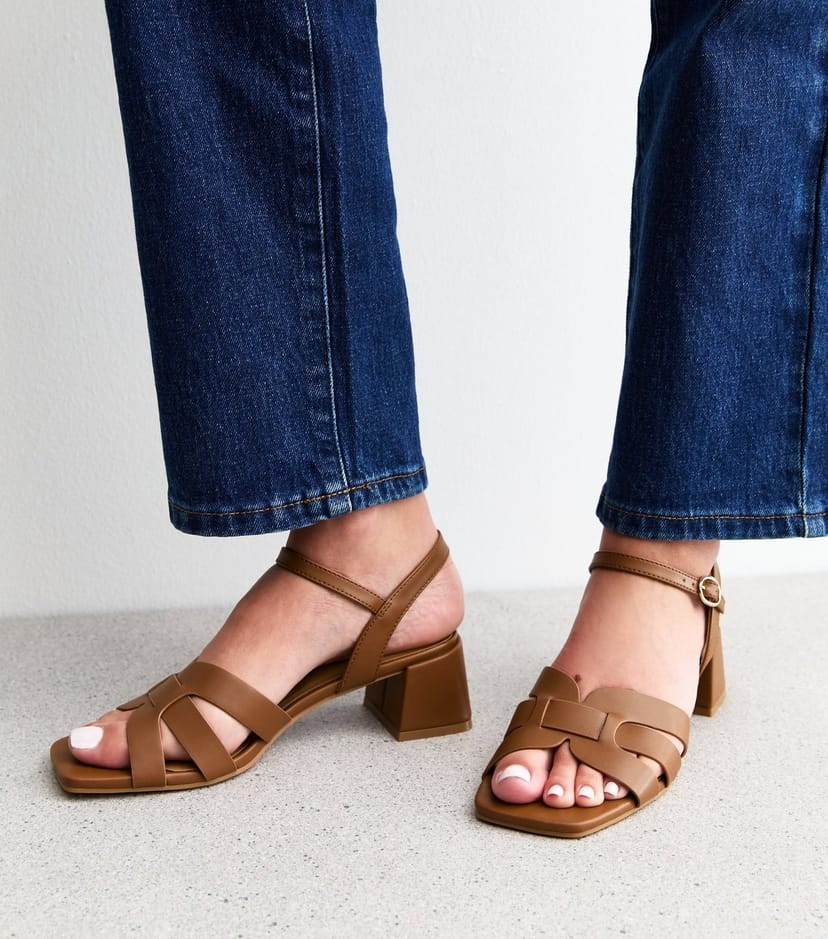 The New Look Tan Faux Leather Strap Heeled Sandals is available in sizes 9.