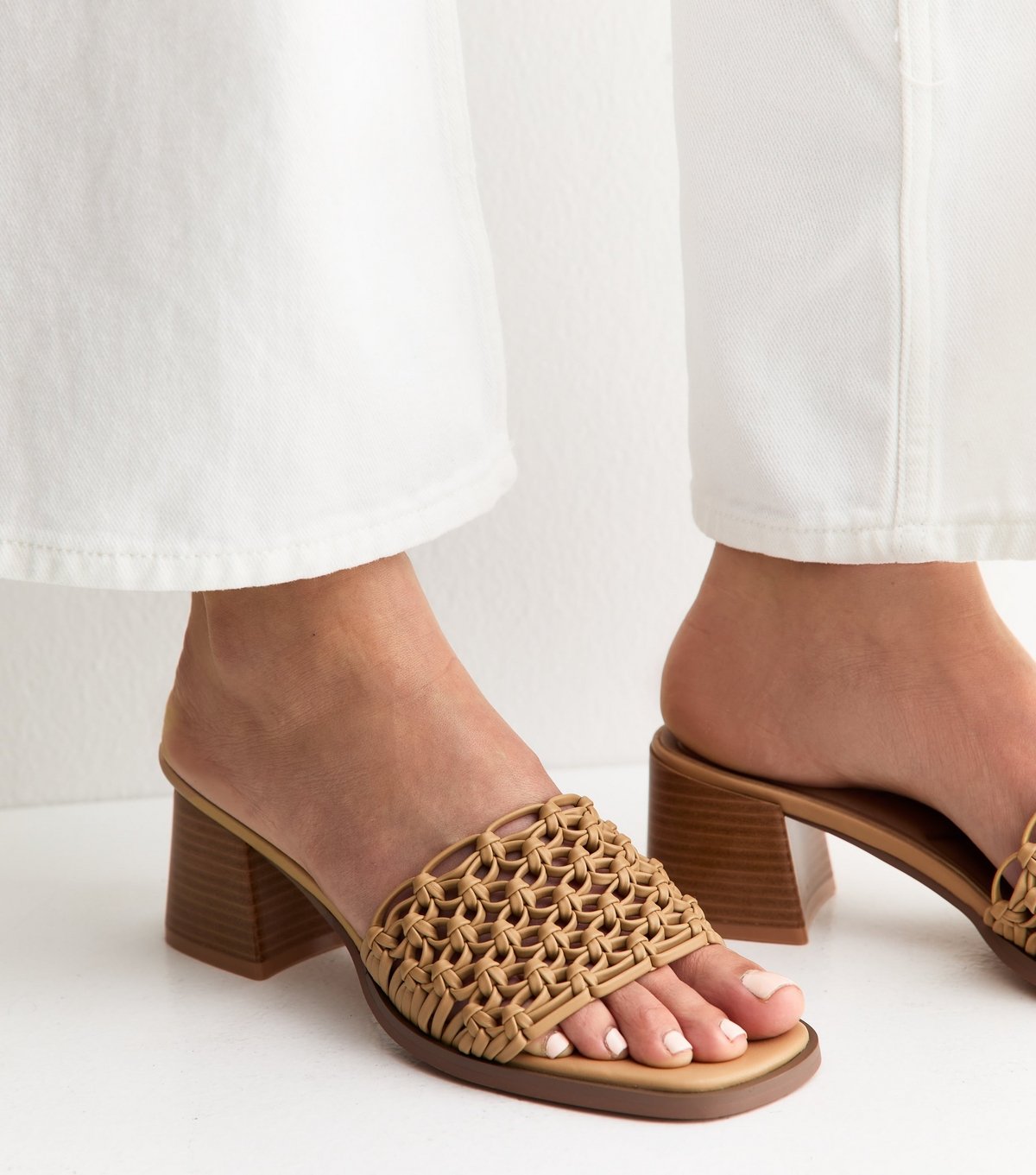 Stylish camel faux leather block heel sandals with a woven top strap. Perfect for summer, these sandals feature a comfortable block heel and easy slip-on design. Made with vegan materials and registered by The Vegan Society.