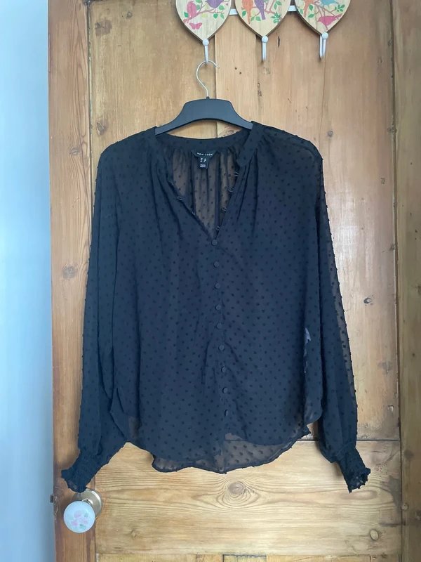 Lovely chiffon top from New Look in black with spots and covered buttons. Features ruched cuffs for a stylish touch. Ideal for casual and smart-casual occasions.