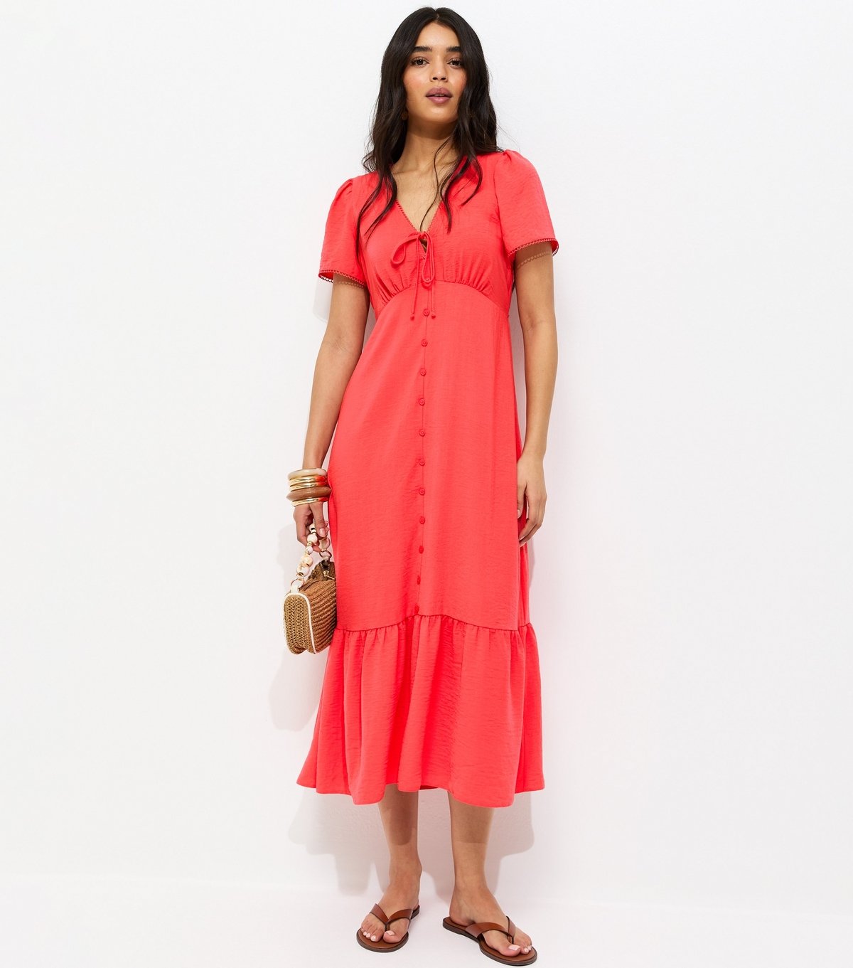The New Look Dark Coral Midi Dress with Bow Detail is ideal for summer, wedding-guest, party.