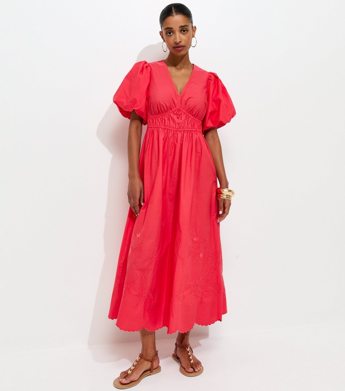 The New Look Dark Coral Cotton Puff Sleeve Midi Dress is available in sizes 10, 12, 14, 16, 18, 20, 22, 6, 8.