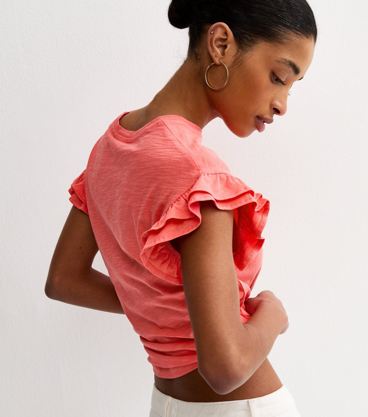 The New Look Dark Coral Cotton Slub Frill Sleeve T-Shirt is made from cotton, jersey.