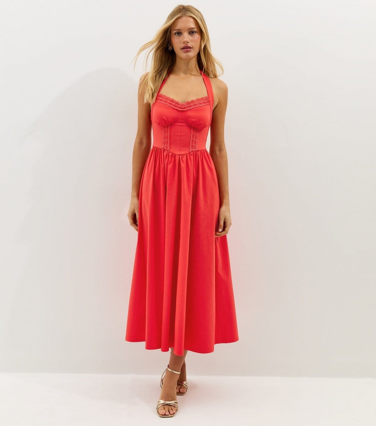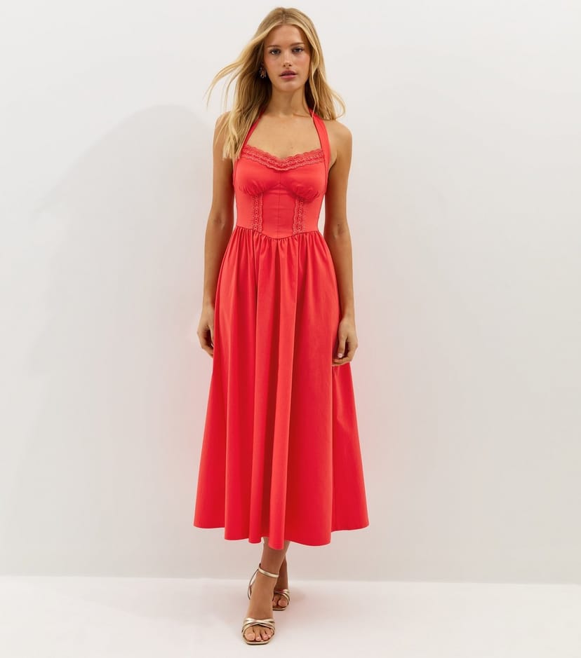 The New Look Dark Coral Embroidered Halter Midi Dress is available in sizes 10, 12, 14, 16, 18, 20, 22, 6, 8.