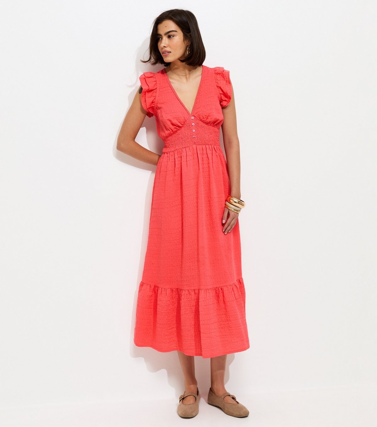 This dark coral seersucker midi dress features playful ruffled cap sleeves and a flattering empire waist. Its textured fabric adds a summery touch to the elegant midi dress.