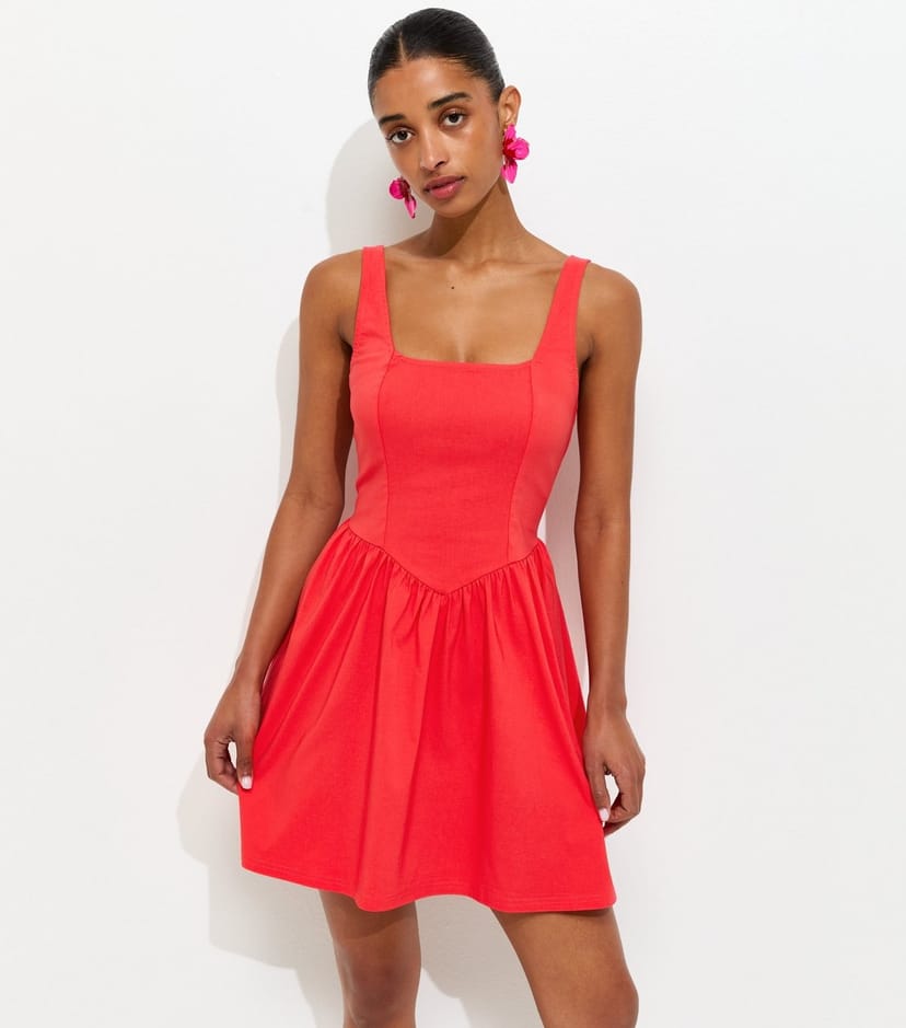 The New Look Coral V-Shaped Waist Mini Dress is available in sizes 10, 12, 14, 16, 18, 20, 22, 6, 8.