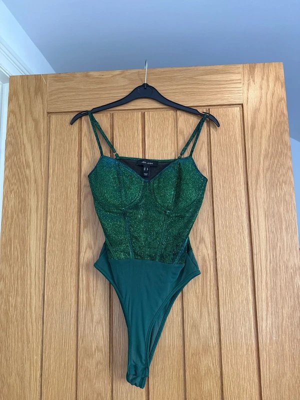 The New Look Dark Green Glitter Corset Bodysuit is available in sizes S.