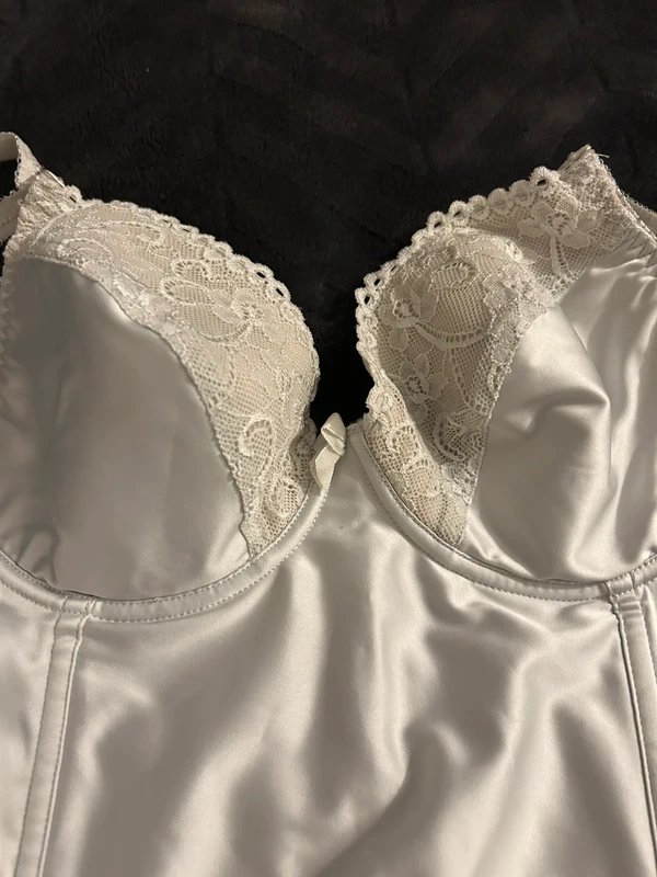 The New Look Satin Short Corset in Silver Grey is made from satin, lace.