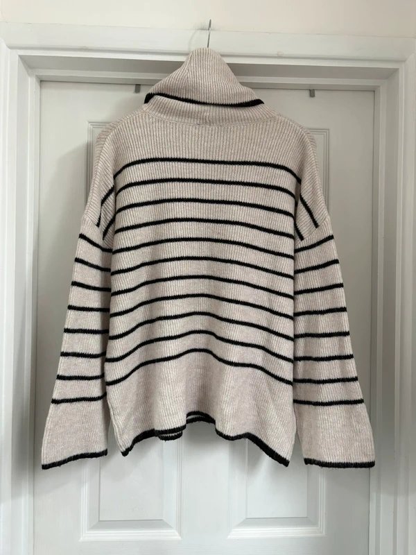 The New Look Cream and Black Striped Oversized Knitted Sweater is available in sizes M.