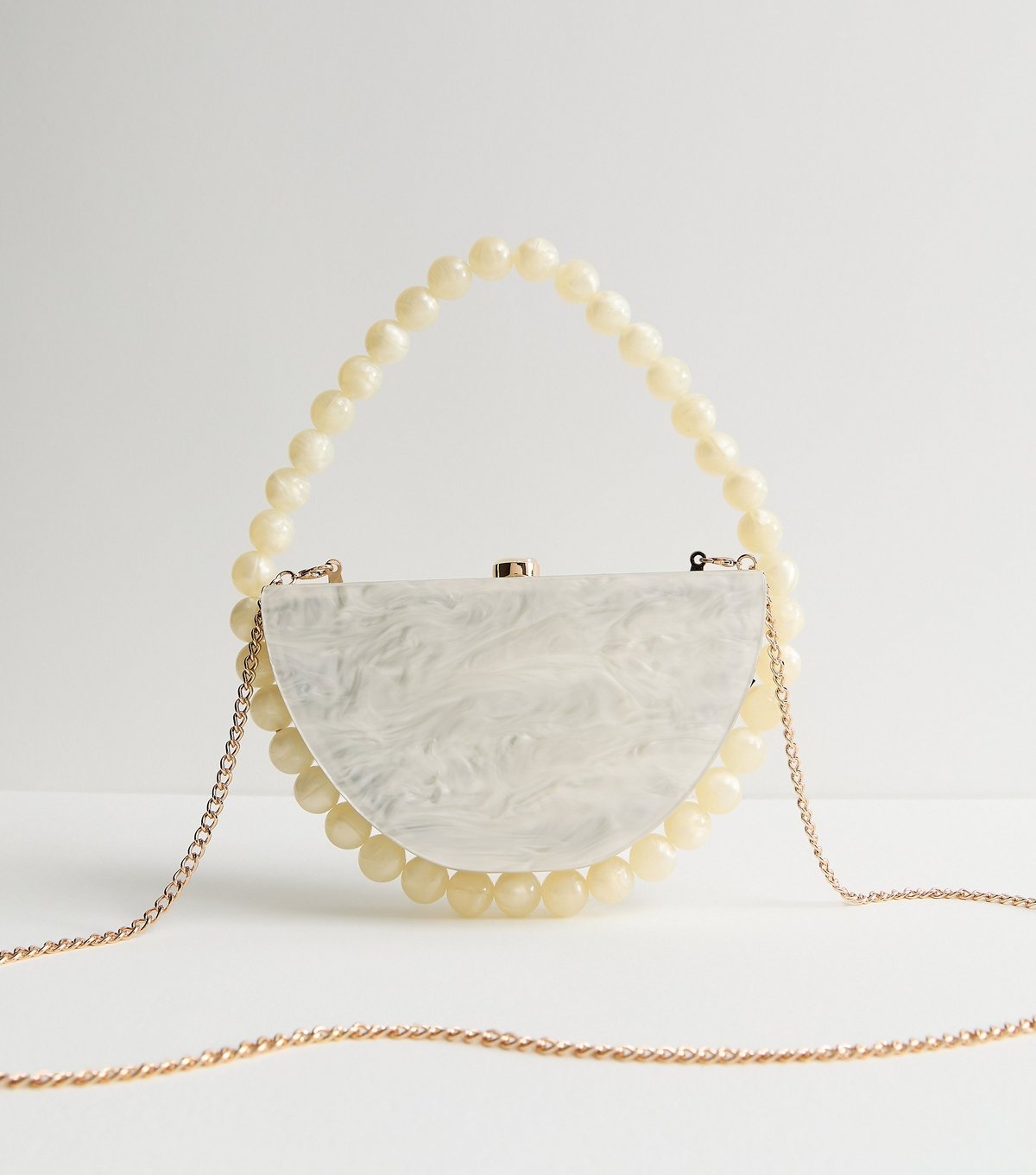 This cream pearl effect box clutch by New Look features a minimalist design with a faux-pearl handle and chain strap. The structured boxy silhouette adds a touch of glamour to any outfit.