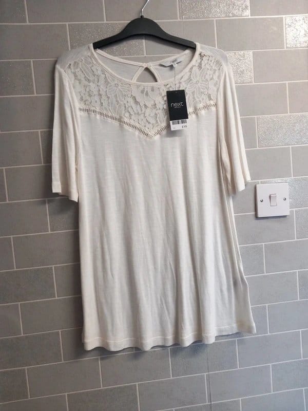 The New Look Cream Lace Detail T-Shirt Style Top UK 10 is available in sizes S.