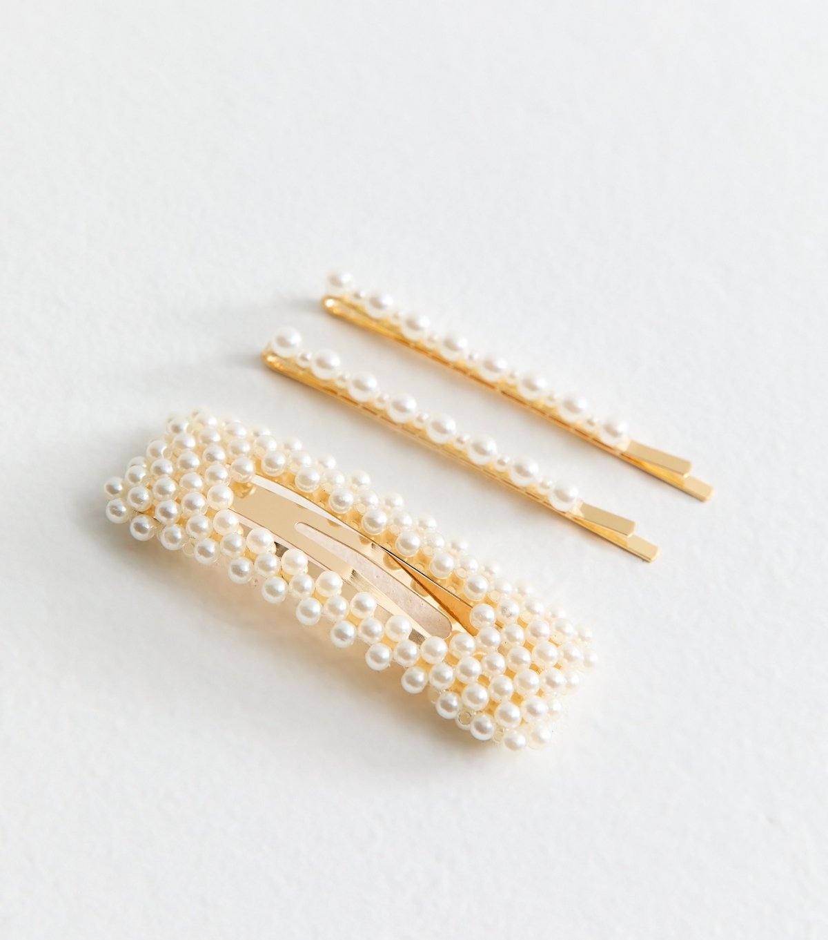 Elegant gold faux pearl hair slides from New Look. This pack of three features decorative faux pearls and gold-tone hardware. Ideal for evening events or to add a touch of glamour to any look.